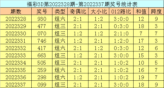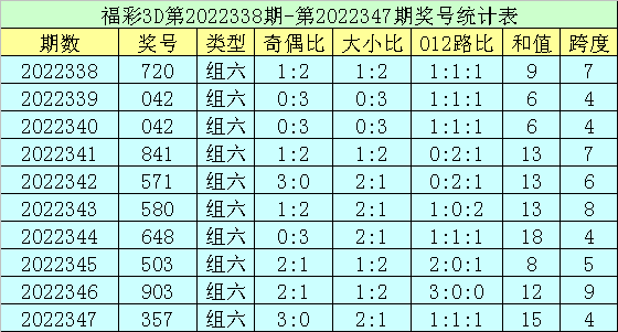 上期回顾:福彩3D第2022347期开奖号码为357,组选类型为组六,奇偶比为3:0,大小比为2:1。