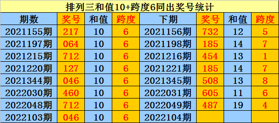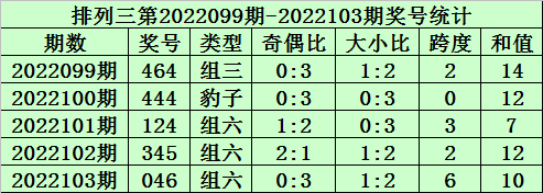 开奖回顾:排列三第2022103期奖号开出:046,组选类型:组六,大小比为1:2,奇偶比为0:3,和值为10,跨度为6。