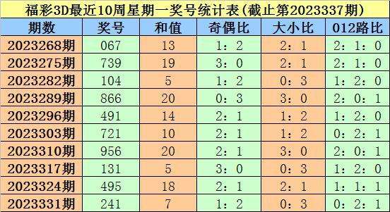 福彩3D第2023331期(上周星期一)奖号为241。其中奖号奇偶比为1:2,大小比为0:3,012路比为0:2:1。