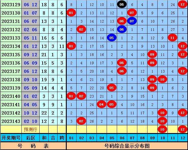 后区分析:后区上期开出号码02和10,分别遗漏2期和0期,目前后区01-12区间冷温热号码个数比为3:3:6,本期后区注意号码10+12。