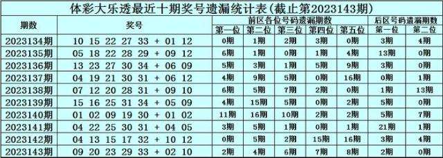 第2023143期奖号:09 20 23 29 33 + 02 10 ,各位号码遗漏期数为:2期、4期、6期、7期、8期 + 2期、0期。