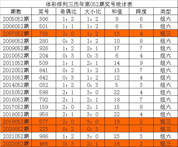 体彩排列三历年第052期开出奖号分别为:306、501、733、280、926、204、509、841、642、032、598、792、159、958、577、223、986、466。统计详见下表: