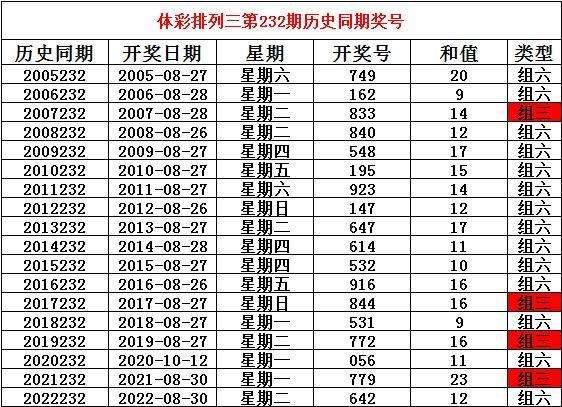 2023年8月30日排列三第232期开奖,历史同期分别开出奖号: