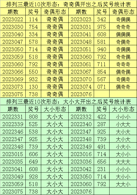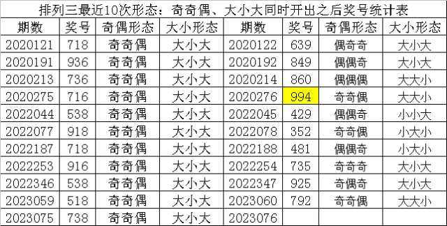 排列三最近10次同时开出奇偶形态:奇奇偶和大小形态:大小大时其奖号分别为:718-936-736-716-538-918-718-916-538-518-738,下期分别开出号码为:639-849-860-994-429-352-481-735-925-792,详细统计见下表:
