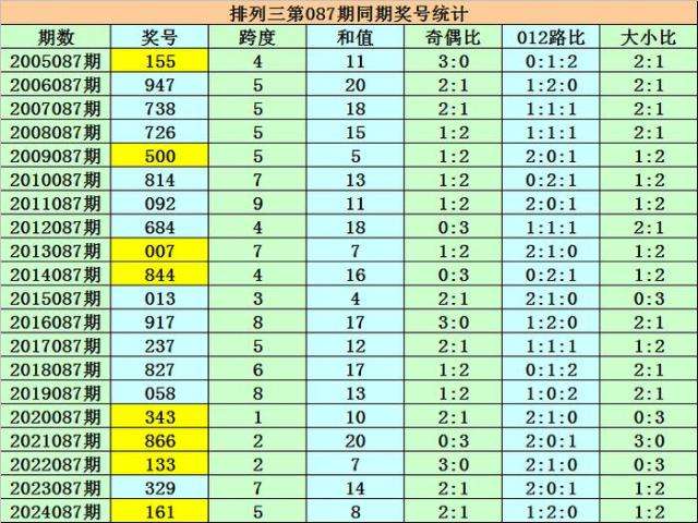 上期回顾:排列三第2024087期奖号为161,组选类型为组三,奖号大小比为1:2,012路比为1:2:0,奇偶比为2:1。
