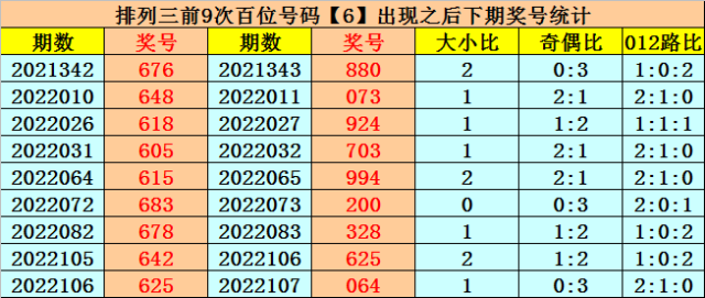 在百位前9次出现号码6之后,下期百位分别开出奖号:8-0-9-7-9-2-3-6-0,其中开出号码个数奇偶比是4:5,大小比是5:4,012路比是6:1:2。