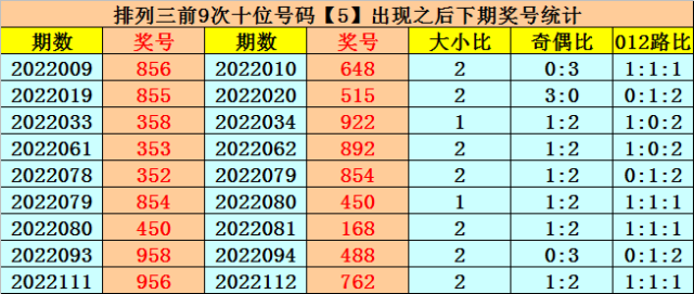 在十位前9次出现号码5后,其下期奖号分别开出:4-1-2-9-5-5-6-8-6,其中奖号个数012路比是3:2:4,奇偶比是4:5,大小比是6:3。