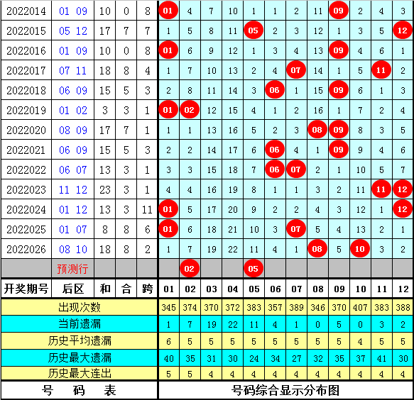 在历史同期开奖中,后区号码和值奇偶为7:8,基本持平,本期看好奇号和值出现,参考和值7。
