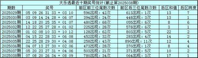体彩大乐透第25038期奖号开出:07 08 20 26 34+08 09,前区奖号大小比为3:2,012路比为0:2:3,奇偶比为1:4,后区号码和值为17,跨度为1。