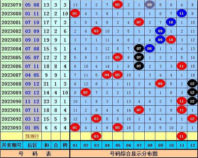 后区号码分析:第094期历史同期开奖中,后区两码全大开出3次,全小开出1次,一大一小开出11次,本期后区预计出现一大一小奖号,参考号码03、04、07、11。