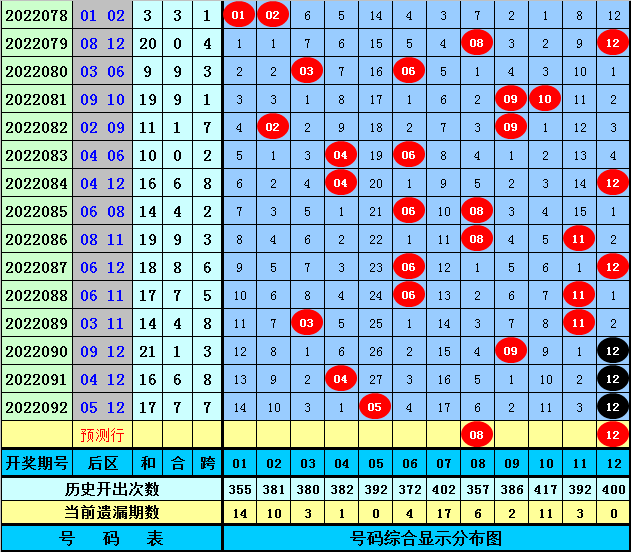 后区分析【一区01-04,二区05-08,三区09-12】:上期后区奖号为05和12,分别落在第二、三区,近50期后区三区比为30:33:37,近10期三区比为4:7:9,本期注意第二、三区号码出现,关注两码08+12。