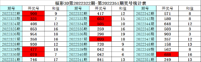上期回顾:福彩3D第2022351期奖号为:249,其中奖号组选类型为:组六,奇偶比为1:2,大小比为1:2,012路比为1:1:1,和值为15,跨度为7。