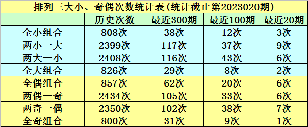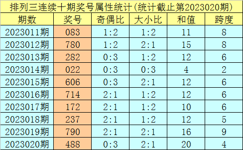 上期回顾:排列三第2023020期奖号:488。类型:组三,奇偶形态:偶偶偶,大小形态:小大大,和值:20,跨度:4。