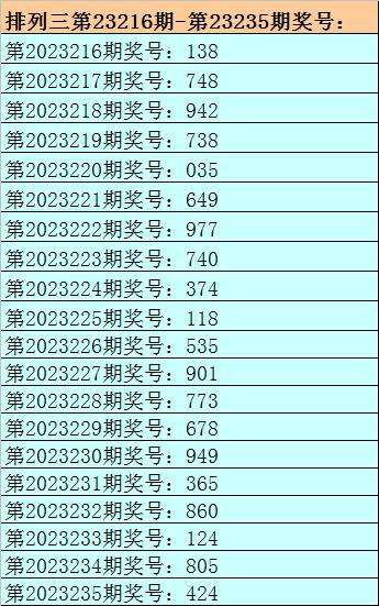开奖回顾:排列三第2023235期开出奖号:424。其中奖号大小比为0:3,奇偶比为0:3,012路比为0:2:1,和值为10,跨度为2。