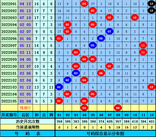 后区分析:上期后区奖号为01和04遗漏期数分别为1期和2期,目前后区遗漏5期以内的热码有7个:01、02、03、04、05、06、12,遗漏4期以上的热码有5个,本期后区适当关注重号出现,参考两码04、08。