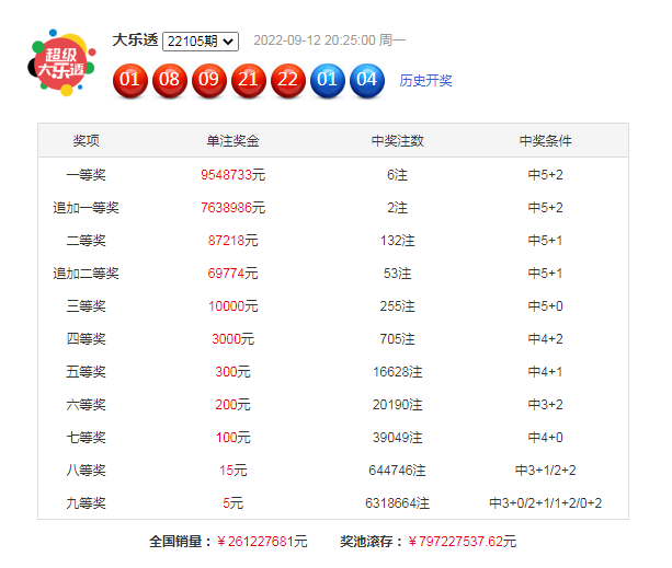 2022105期前区01 08 09 21 22;后区01 04。当期前区号码大小比为2:3,三区比为3:2:0,奇偶比为3:2。前区开出2组连号08 09、21 22;1组同尾号01 21。后区两码遗漏期数分别为1期和2期。