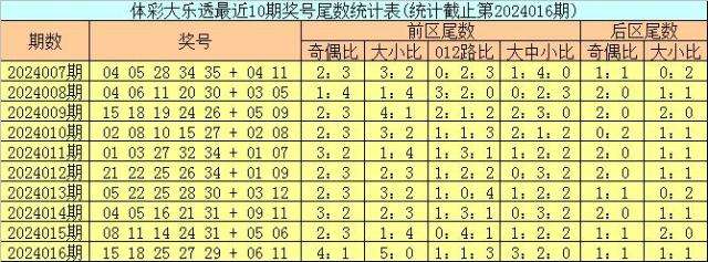 上期回顾:体彩大乐透第2024016期开出号码:15 18 25 27 29 + 06 11,其中前区奖号尾数奇偶比为4:1,大小比为5:0,012路比为1:1:3,大中小比为3:2:0,后区奖号尾数奇偶比为1:1,大小比为1:1。