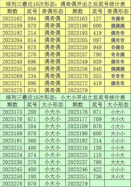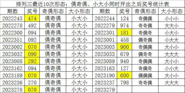 排列三最近10次同时开出奇偶形态:偶奇偶和大小形态:小大小时其奖号分别为:474-492-094-092-070-090-292-094-070-270-070,下期分别开出号码为:124-974-181-458-900-679-940-127-600-798,详细统计见下表: