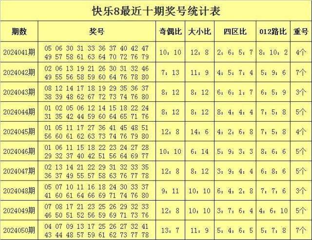 福彩快乐8第2024050期开奖回顾:04 07 09 13 17 25 26 27 32 41 43 44 48 57 59 61 62 73 77 78,其中奖号奇偶比为13:7,大小比为11:9,四区比为5:4:6:5,012路比为5:7:8,重号7个:07、17、25、26、32、59、73。