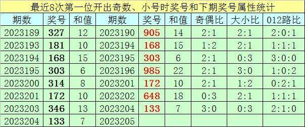 前7次第一位号码开出奇数、小号时奖号分别为:327、181、168、303、314、172、346,其中奇偶总比例为12:9,每期奖号奇偶比与上期奖号奇偶比都不相等;号码大小总比例为6:15,有2期奖号大小比与上期大小比相同;