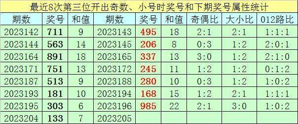 上期回顾:福彩3D第2023204期开出奖号为133,奖号奇偶比为3:0,大小比为0:3,012路比2:1:0。