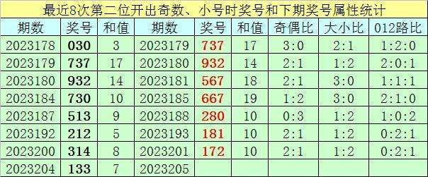 前7次第二位号码开出奇数、小号时奖号分别为:030、737、932、730、513、212、314,其中奇偶总比例为14:7,有2期奇偶比与上期奇偶比相同;号码大小总比例为5:16,有3期奖号大小比与上期大小比相同;
