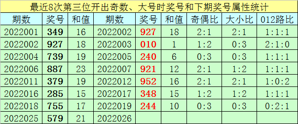 前7次第三位号码开出奇数、大号时奖号分别为:349、927、739、887、379、285、755,其中奇偶总比例为15:6,有3期奇偶比与上期奇偶比相同;号码大小总比例为15:6,有2期奖号大小比与上期大小比相同;