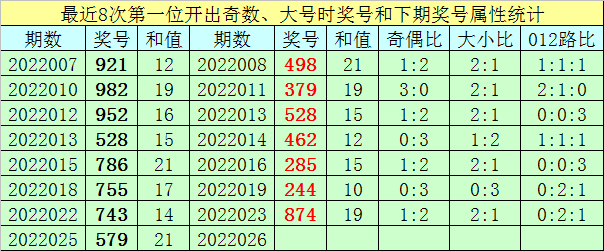 前7次第一位号码开出奇数、大号时奖号分别为:921、982、952、528、786、755、743,其中奇偶总比例为12:9,有1期奇偶比与上期奇偶比相同;号码大小总比例为14:7,有2期奖号大小比与上期大小比相同;