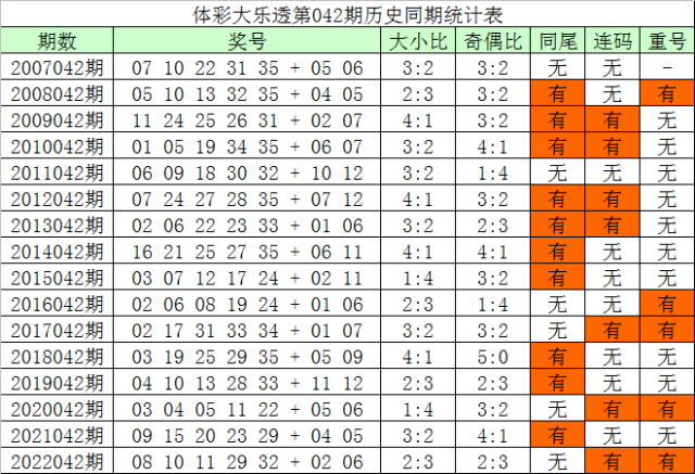 大乐透第042期历史开奖16次,奖号统计见下表:
