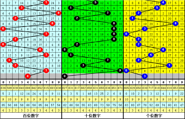 百位:近期大小号码开出比例基本相当,上期开出大号之后,本期注意该位小号出现;另外,该位0路和1路号码在最近19期奖号中走势较热,2路号码表现相对较冷,本期该位放弃2路号码,参考号码4。