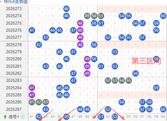 三区间开出了7个奖号(43.48.49.52.57.58.60)上期回顾三区开出7个奖号上期的三区间的奖号数量呈现一个递增的形态,4头回补3个号码,5头回补3个,本期先来看号码42近期出现频率相对来说还不是很稳定的一个号码。说明其在近期的开奖中较温热,号码46在近 30 期内出现次数还是很稳定,间隔上来说也是很稳定。号码51近期比较温热的一个号码,通常间隔3-4期会出现一次,没有明显的连续出现态势,走势相对较温热,在整个第三区间的表现可以防守的。号码53近期走势相对近期比较温热,近期没有连续间隔落号的情况,活跃度近期处于温热态注意防守。