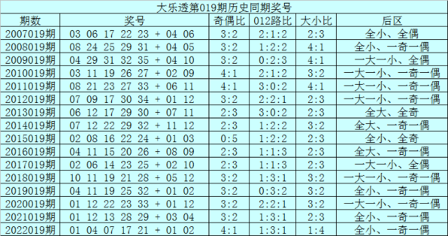 后区第二位分析:在历史第019期同期奖号中,后区第二位号码全部在02-12区段出现,其中该位号码012路比为8:3:5,奇偶比为6:10,大小比为10:6,本期第二位号码关注03。