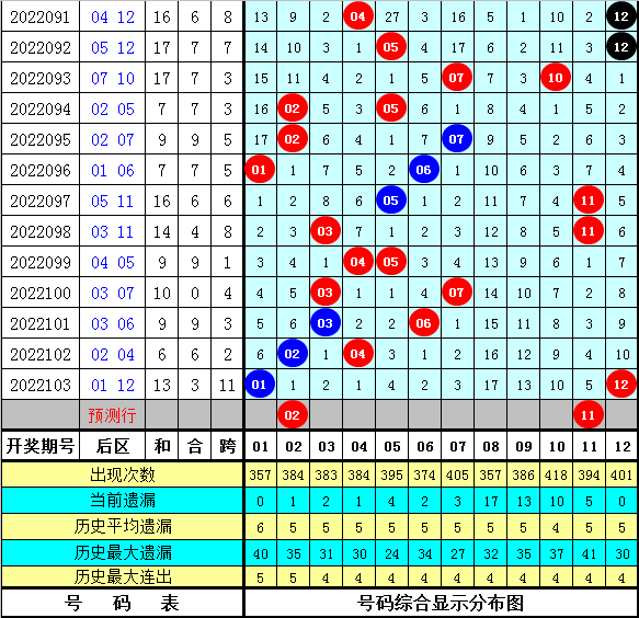 4、在历史同期第104期开奖中,前区号码012路总比例为20:29:21,1路号码表现活跃,本期防1路号码走冷,轮空,参考012路比3:0:2。