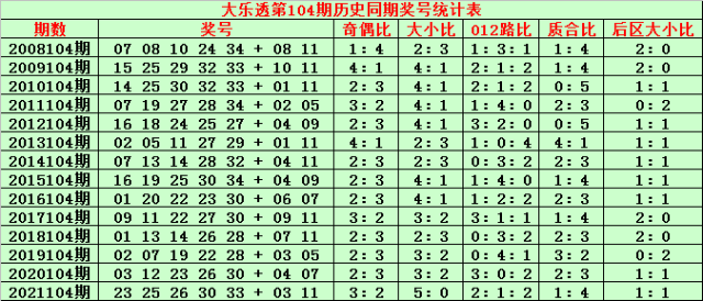 3、在历史同期第104期开奖中,前区号码大小总比例为46:24,大号表现相对较热,本期看好大号继续热出,关注大小比3:2出现;