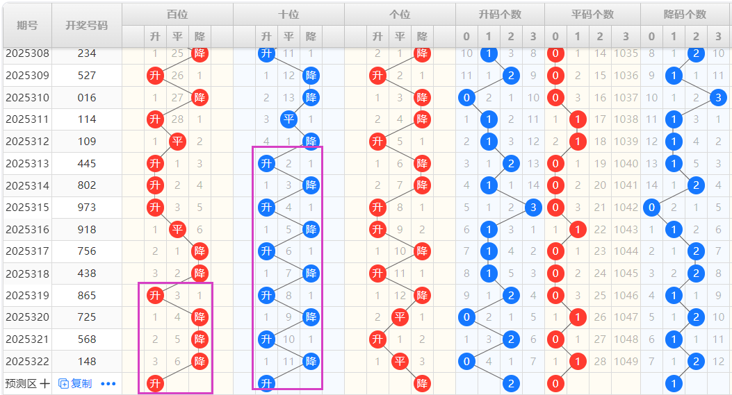 【排列3个位】:近十期升降走势为:降-升-降-降-升-升-降-升-降-平-升-平,为一种单一加重复性的交错走势,结合走势图可以看出,图中紫色框圈出为一种M形态的出球方式,本期可以重点看好升的形态号码的开出。