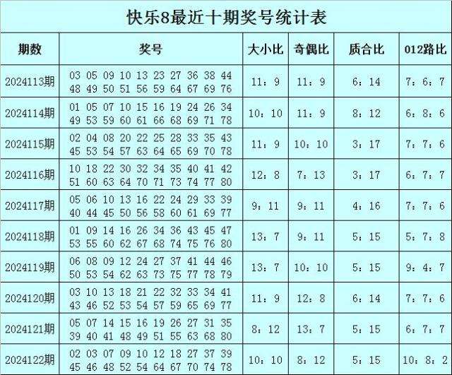 福彩快乐8第2024122期开奖回顾:02 03 07 09 10 12 18 27 37 39 45 46 48 52 54 64 67 70 74 78,其中奖号大小比开出10:10,奇偶比开出8:12,质合比开出5:15,012路比开出10:8:2。