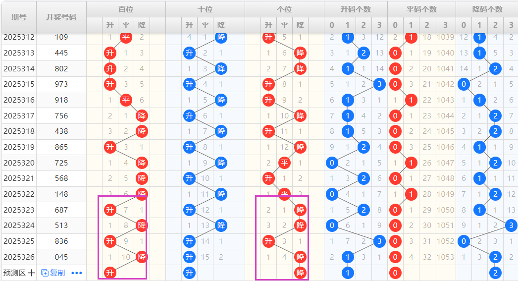 【排列3个位】:近十期升降走势为:降-平-升-平-降-降-升-降,为一种单一加重复性的交错走势,结合走势图可以看出,图中紫色框圈出为一种M形态的出球方式,本期可以重点看好升的形态号码的开出。