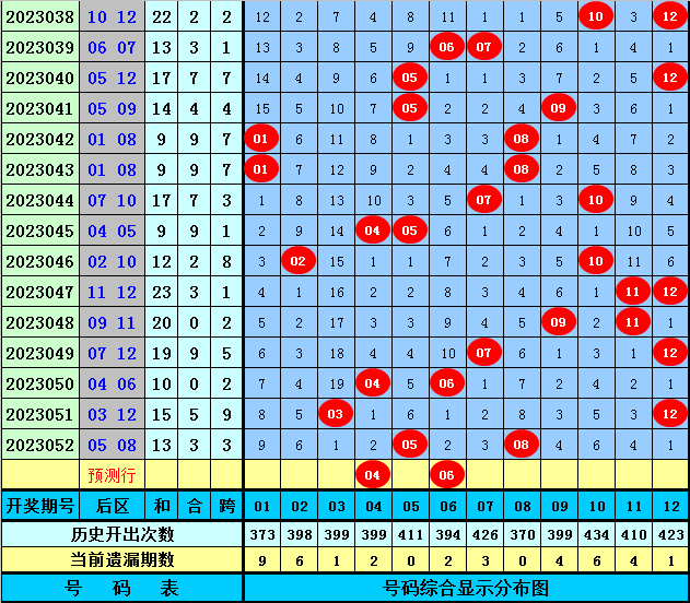 后区分析:上期后区开出奖号05和08,在最近50期开奖中,后区奖号012路落号比为36:32:32,前10期后区012路落号比为6:7:7,本期后区关注号码01、03、04、06、12,两码参考04、06。