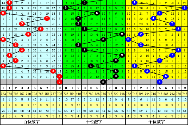 跨度:近5期跨度分布在3-8之间,振幅为6点,分布非常分散,上期跨度为3,下降2点,本期注意跨度走大,关注4区段。