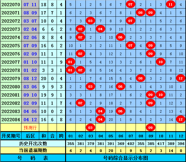 后区分析:上期后区奖号为04和12,最近5期后区和值分别为9、19、11、10、16,后区跨度分布范围在1-8,本期后区注意两码03、09。