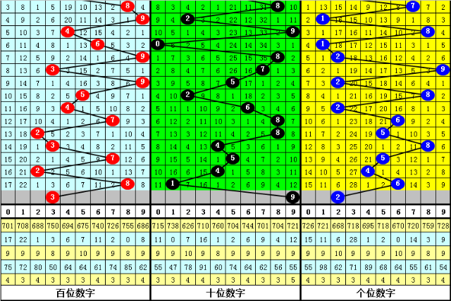 跨度分析:跨度最近10期012路比为3:3:4,012路跨度开出比例相当,最近3期跨度遗漏值分别为2期、0期和7期,本期注意跨度遗漏值走小,防重复跨度出现。