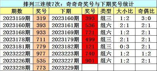 奇偶判断:上期排列三奖号为773,奇偶为:奇奇奇,近7次出现奇偶:奇奇奇奖号分别为:319-393-933-711-779-977-535。