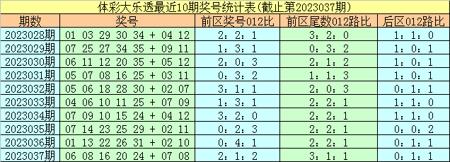 上期回顾:体彩大乐透第2023037期开出奖号:06 08 16 20 24 + 07 08,其中前区奖号012路比为2:1:2,前区尾数012路比为3:1:1,后区奖号012路比为0:1:1。
