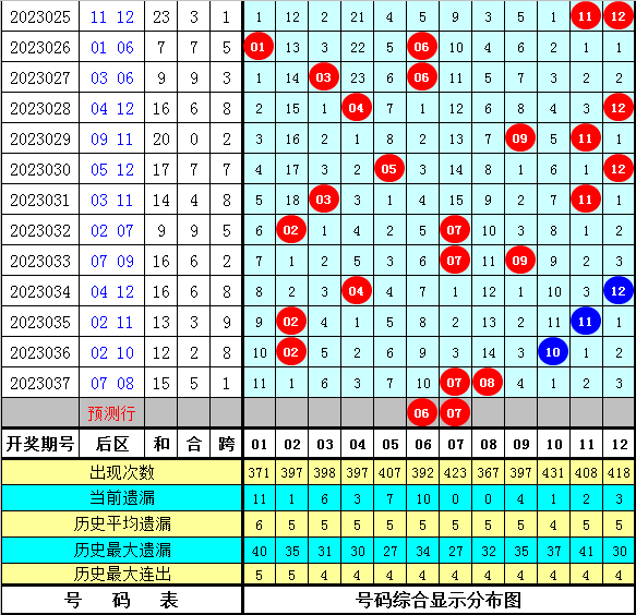 后区奖号分析:最近10期后区奖号012路个数比为6:6:8,其中0路号码明显活跃,本期看好0路号码继续出现,后区号码关注01、06、07、10、12。