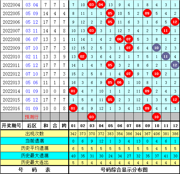 前区第三位:上期奖号为17,开出2路号码,最近10期2路号码出现4次,出现次数与理论相当,本期注意2路号码继续开出,关注05。