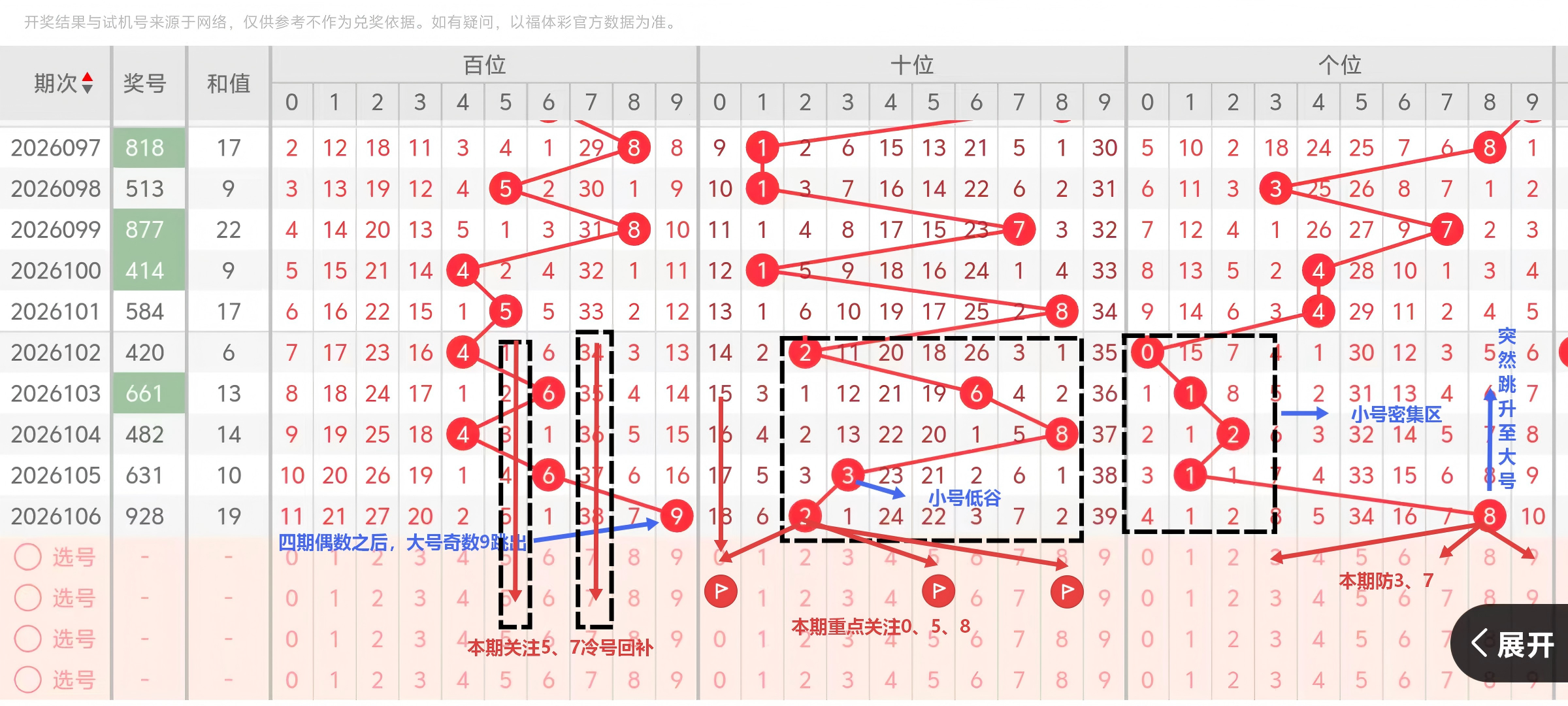 本期建议重点关注5、7的回补,尤其百位和个位。
