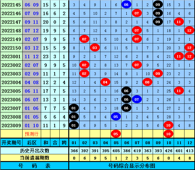 后区分析(定义:01-04为一区,05-08为二区,09-12为三区):上期后区开出奖号01和10,分别出现在第一区和第三区和区,,最近10期后区三个区间落号个数比为7:7:6,本期后区注意第一区和第三区号码出现,关注两码05、10。