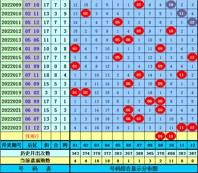 后区分析:后区上期开出2路+0路奖号11和12,最近20期后区0路奖号开出17个,1路奖号出现11个,2路奖号出现12个,最近8期前区0路奖号出现8个,1路奖号出现4个,2路奖号出现4个,本期后区注意号码:02、06、09、10、12,单挑两码组合09+10。
