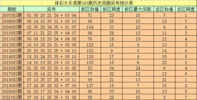3、在第083期历史同期开奖中,前区奖号最大间距出现范围在3-24区段,其中最大间距奇偶个数比为11:4,012路比为10:4:1,本期预计最大间距出现在12-16之间。