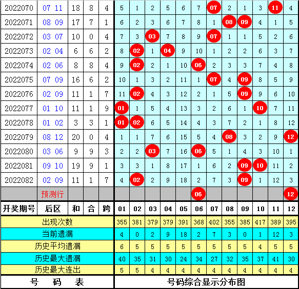 7、在第083期历史同期开奖中,后区奖号和值出现范围在6-22之间出现,其中和值012路比为6:6:3,奇偶比为8:7,大小比为5:10,本期看好后区和值为18。